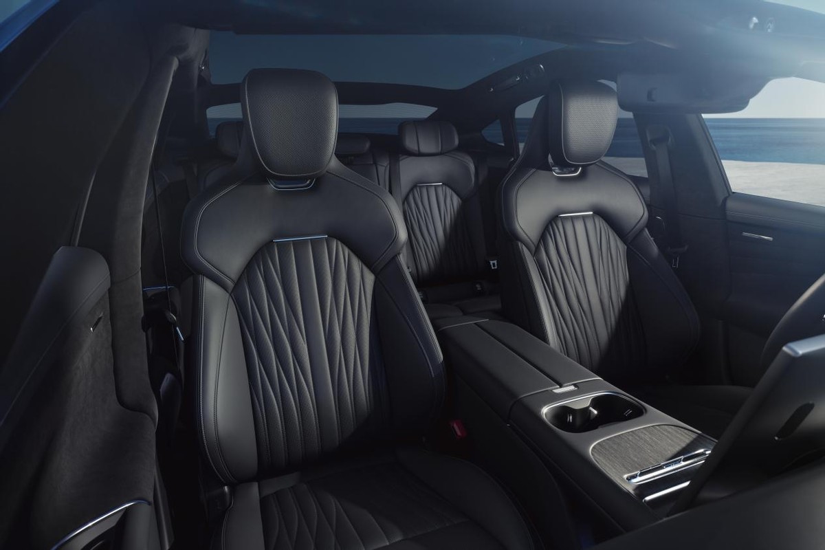 内饰方面,新增一款暗夜黑主题色,座舱布局依旧是环抱式设计,配备悬浮式中控横屏和翻转式仪表,方向盘造型不变,只削减了几枚实体按键,中央扶手处也不再有实体按键,采用木纹饰板装点,环绕式多色氛围灯更具沉浸感,门板和座椅花纹同步进行调整,运动氛围更强。