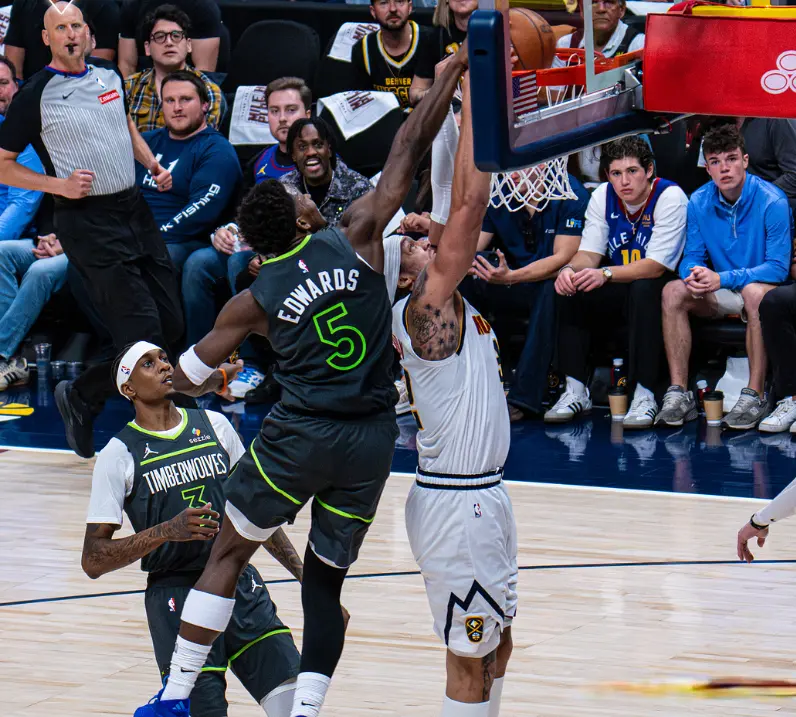 第三节比赛掘金打出一波6-0,随后森林狼回击一波6-0,可之后掘金又打出一波14-0,后面麦丹终于得分止血,穆雷连得3分后麦丹上篮得分,爱德华兹罚球得分后约基奇连得4分,爱德华兹打板得分后康利命中三分,后面约基奇抛投命中,三节比赛结束掘金领先12分。第四节比赛森林狼打出一波10-2,戈登上篮得分后戈贝尔扣篮得分,布劳恩远投命中后戈贝尔完成暴扣,道苏姆上篮得分后掘金打出一波9-2,后面爱德华兹、兰德尔得分止血,接下来戈登、穆雷、约翰逊又帮助掘金拉开比分,最终掘金拒绝逆转赢得比赛胜利。